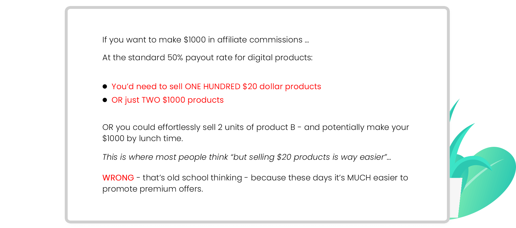 Primarily, results will depend on the nature of the product or business model, the conditions of the marketplace, the experience of the individual, and situations and elements that are beyond your control.